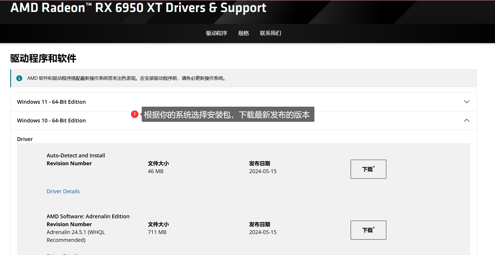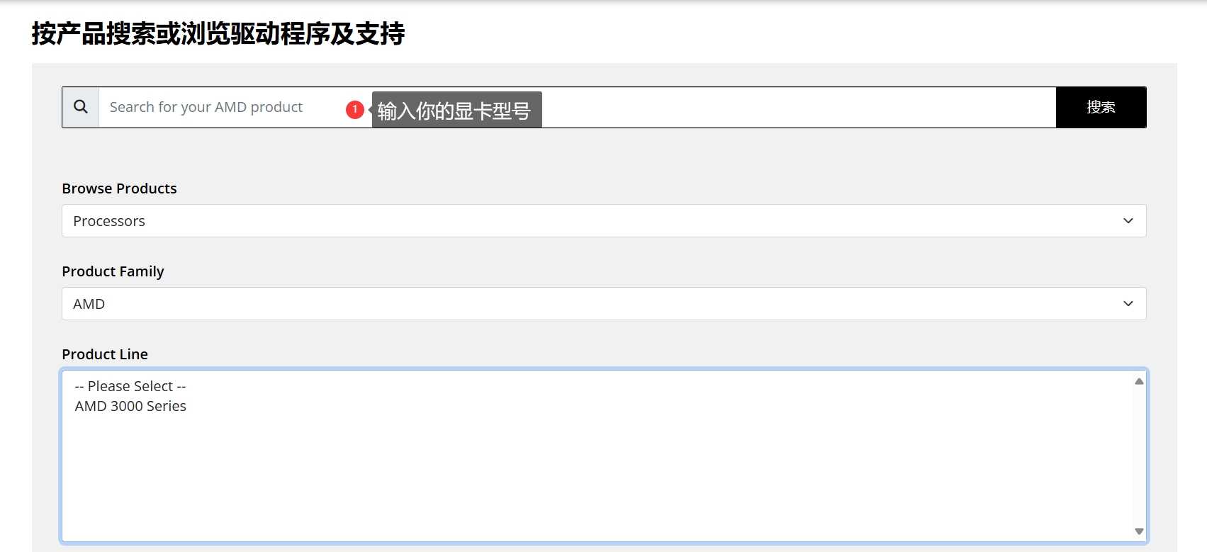 点击链接进入AMD官网,输入自己的显卡型号