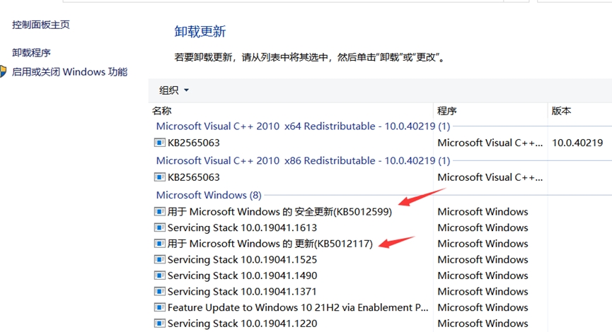 4. 删除Windows自动更新的安全补丁(能删的全删)删除方法:打开控制面板-点击程序中的卸载程序-点击左边的查看已经安装的更新-把KB开头的能删的全部右键卸载,建议关闭电脑自动更新