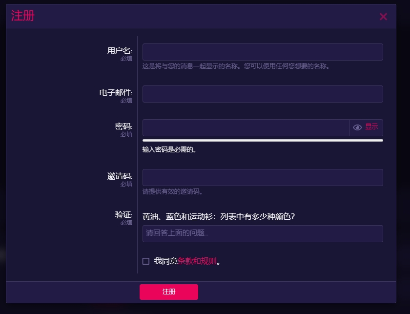 2.按顺序填写:用户名 | 邮箱 | 密码 | 邀请码 | 验证信息。 然后等待下方倒计时结束后,同意隐私条款并点击【Register】注册 ( 注册后可能需要邮箱验证、此时查阅您的邮箱并且点击验证按钮即可 ( 不确定有没有但是账号自带开启两步认证一般是需要的 ) )