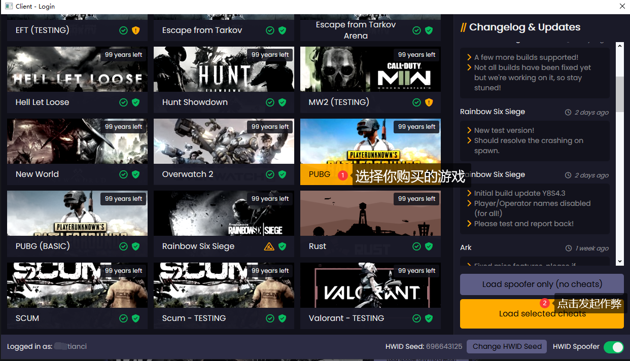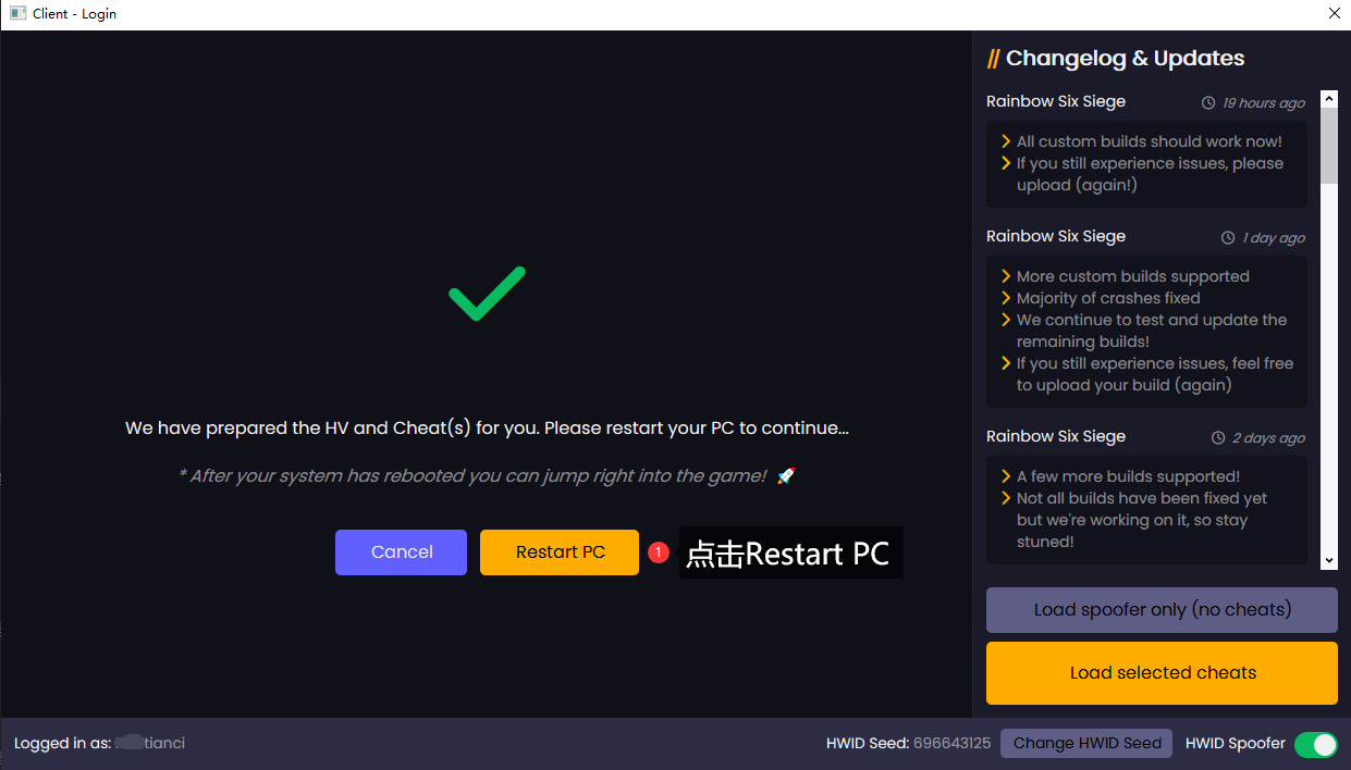 登录后,选择你买的游戏类型,然后点击Load selected cheats注入,等待提示你重启电脑